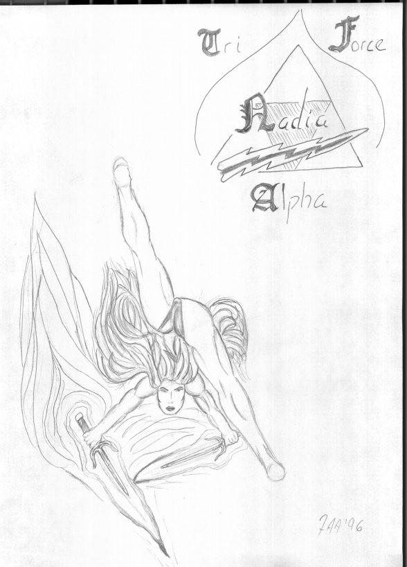 Oh, no! Another one of my failed attempts at making my own superhero(ine) group. This one had the horrible codename "Tri-Force Alpha". Two of the characters were okay, though. This one's the first, and she's called Tanya. I have this thing for long hair, which is very evident in this work...:-)
